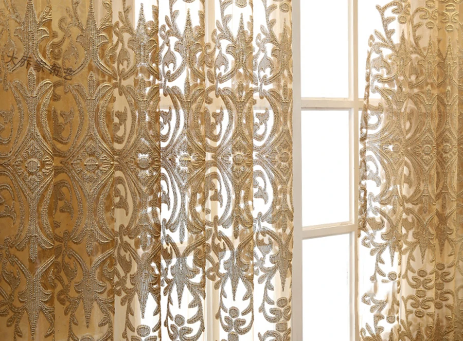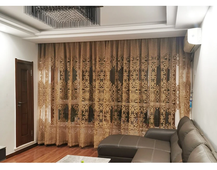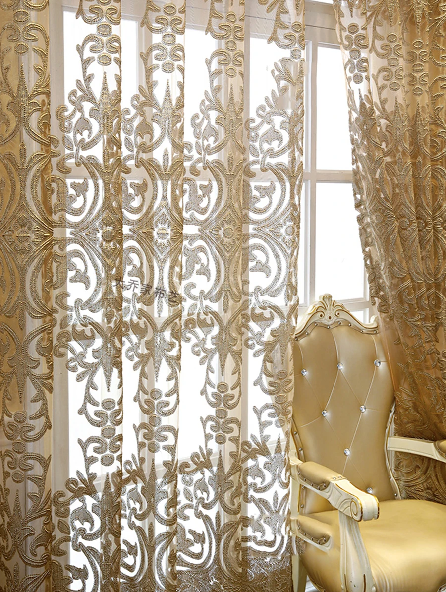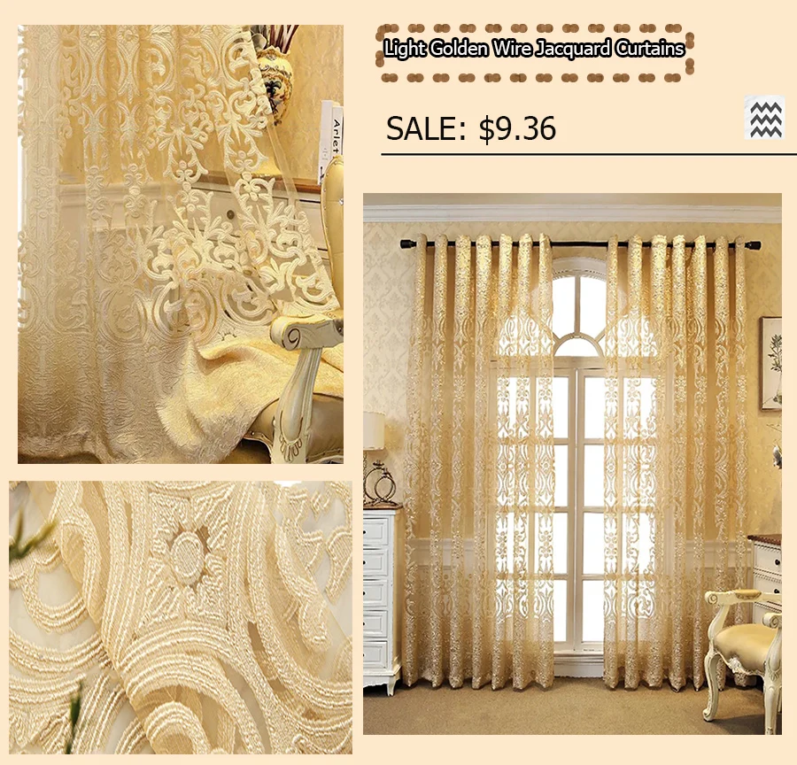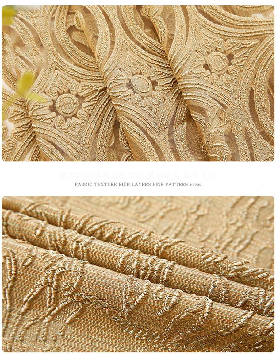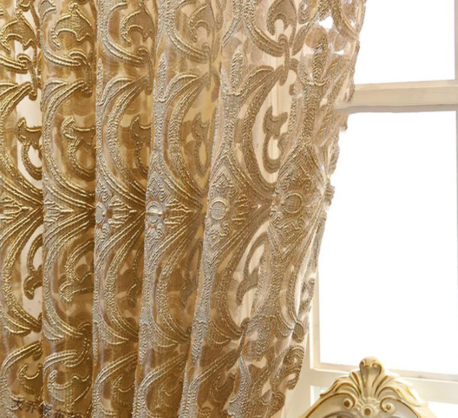 European Luxury Coffee with Golden Wire Jacquard Hollow Tulle Curtain for Living
