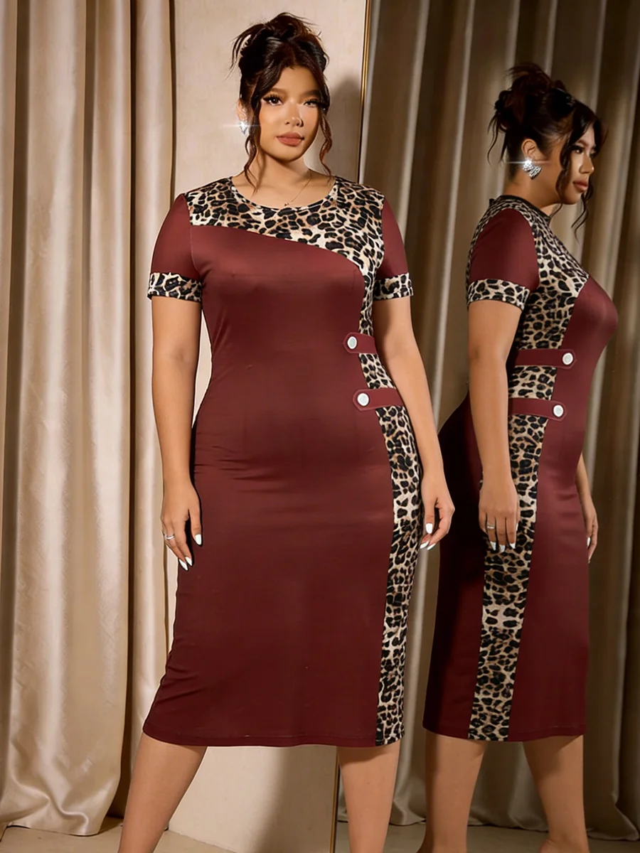 Women's Plus Size Dress Crew Neck Leopard Print Patchwork Short Sleeve Bodycon Midi Dress Elegant Spring Summer Chic Party Dress