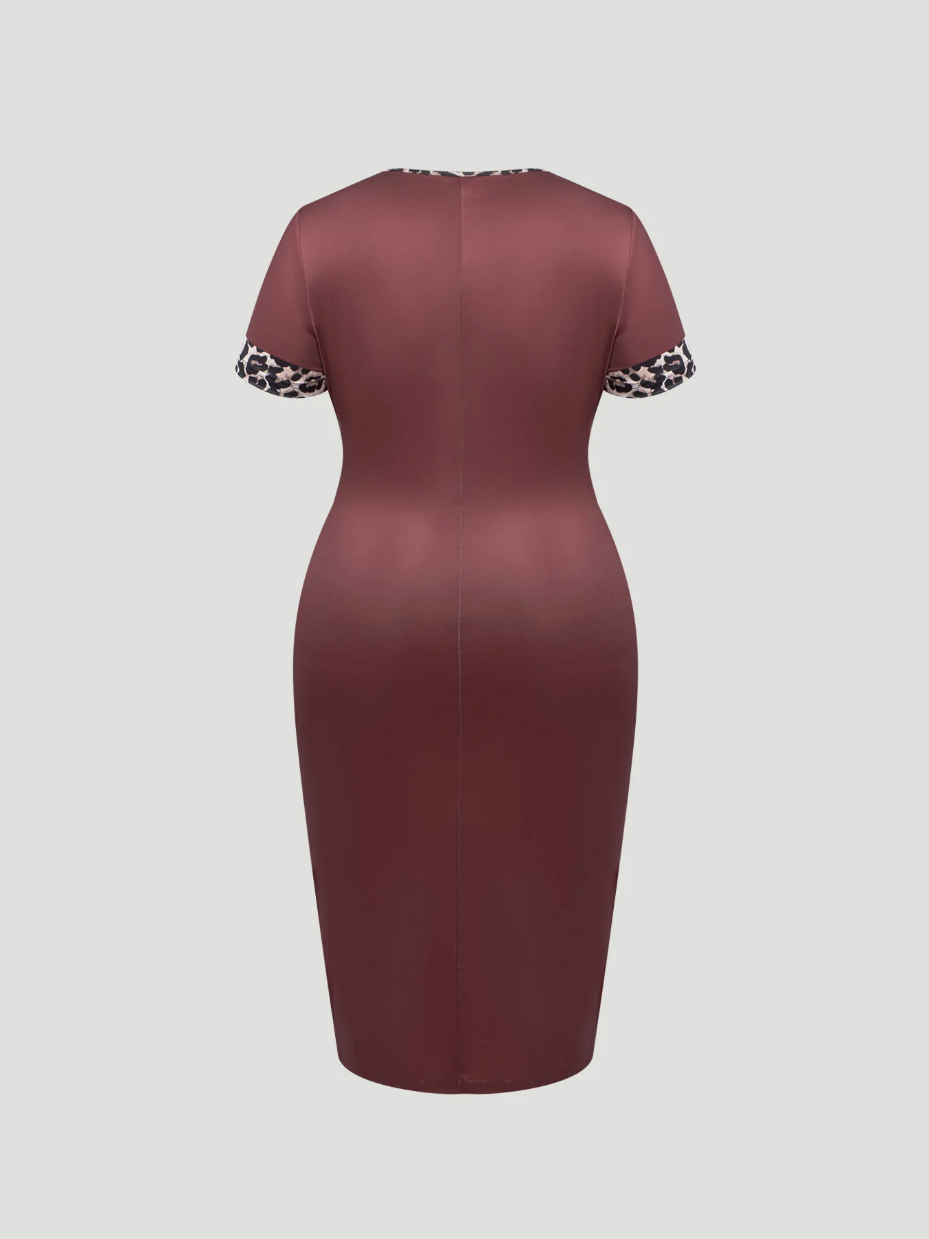 Keywords: plus size leopard patchwork dress, bodycon midi dress, burgundy office dress, plus size work dress with leopard print, button detail bodycon dress, curvy friendly cocktail dress, st patricks day green alternative top, casual commute dress, plus size short sleeve dress, leopard side panel dress, elegant party dress
