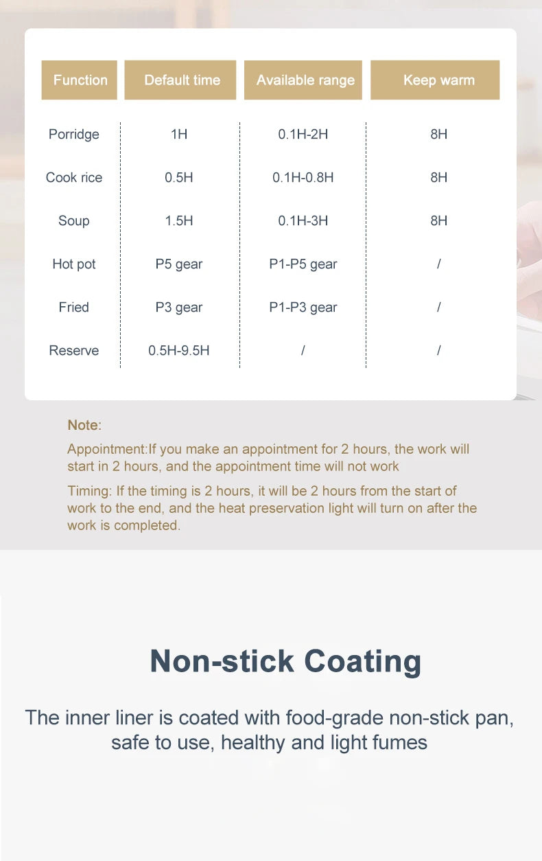 Function: Rice Cooking,Rice Cooking & Porridge Cooking & Soup Stewing,Porridge/Soup,Stewing,Reheating,Heat Preservation