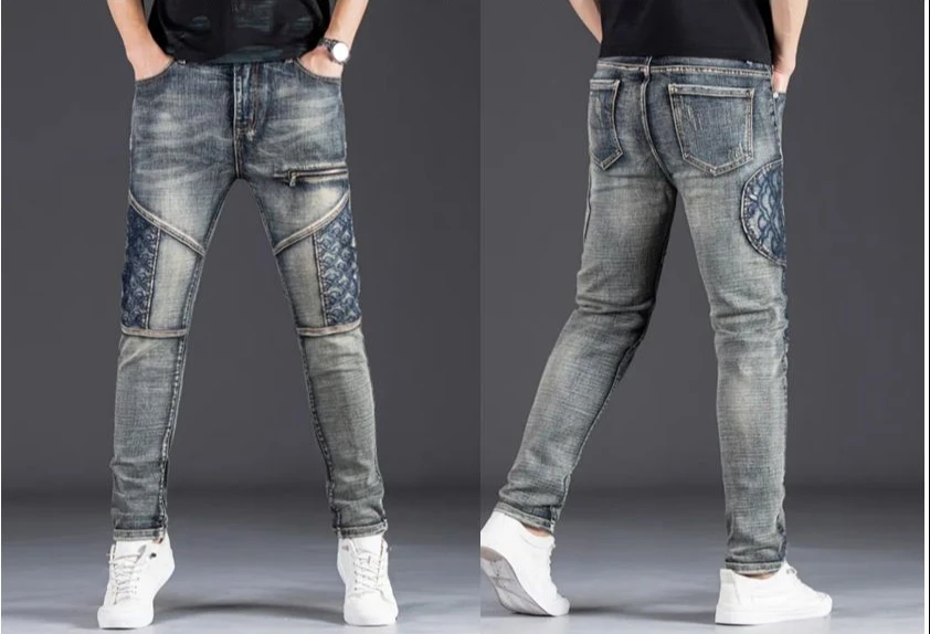 Nostalgic Trendy Motorcycle Men's Jeans Slim Fashion Patchwork Washed Denim