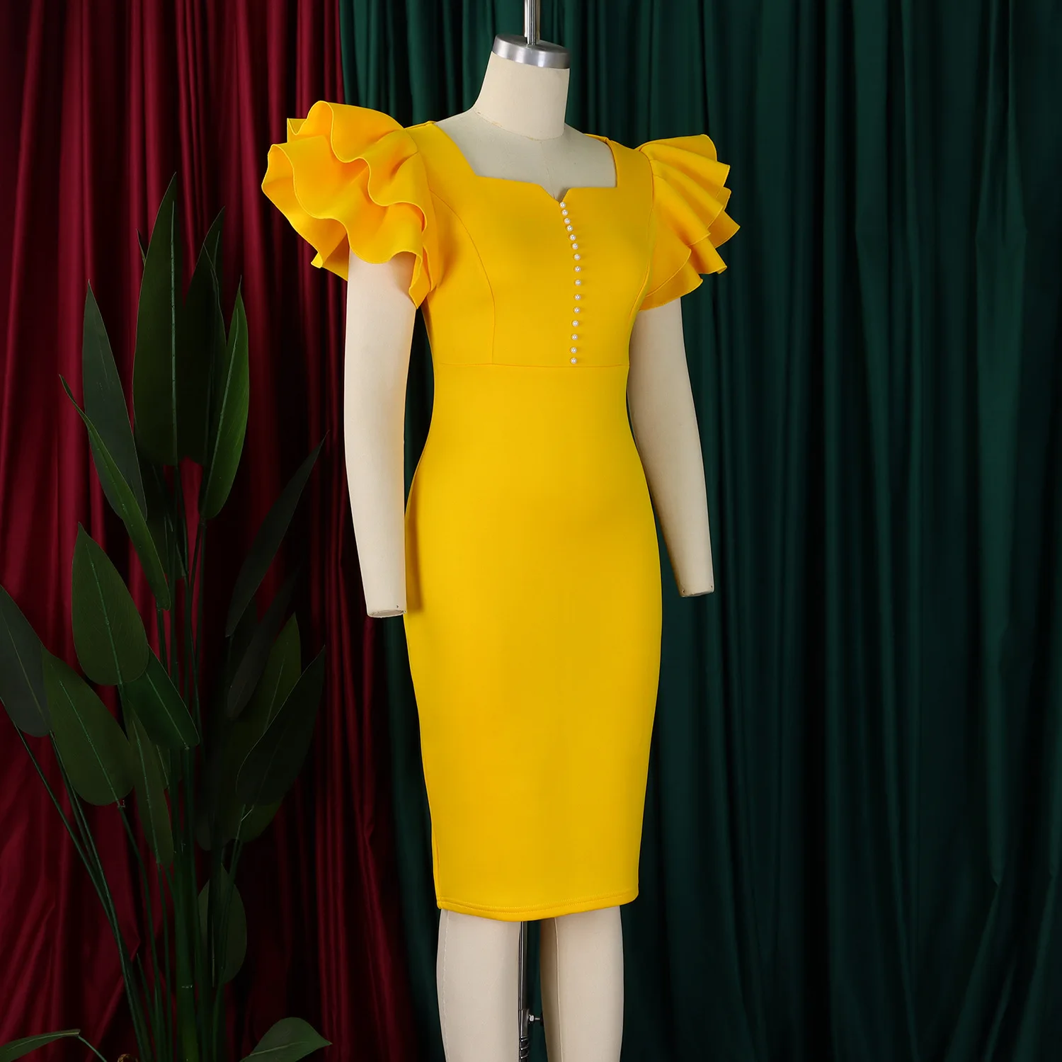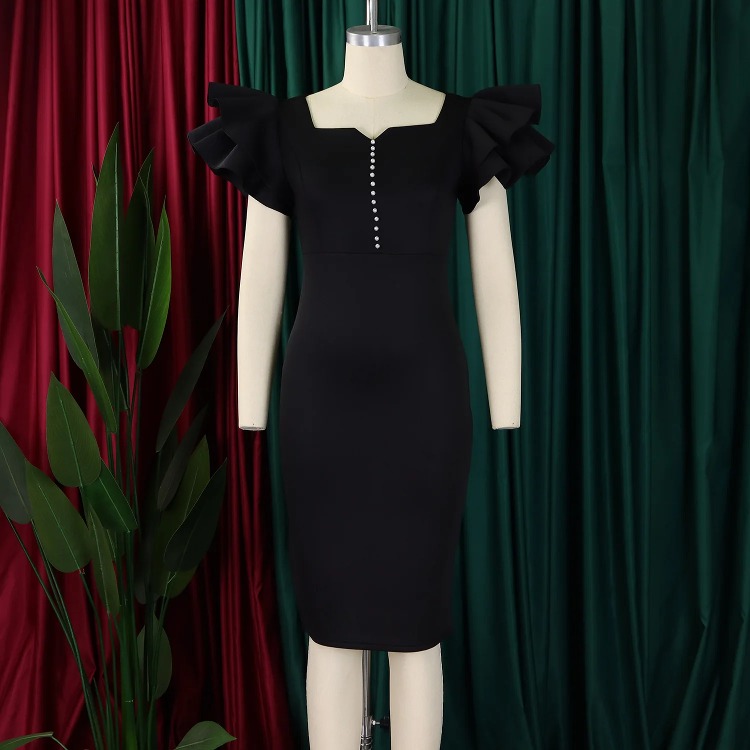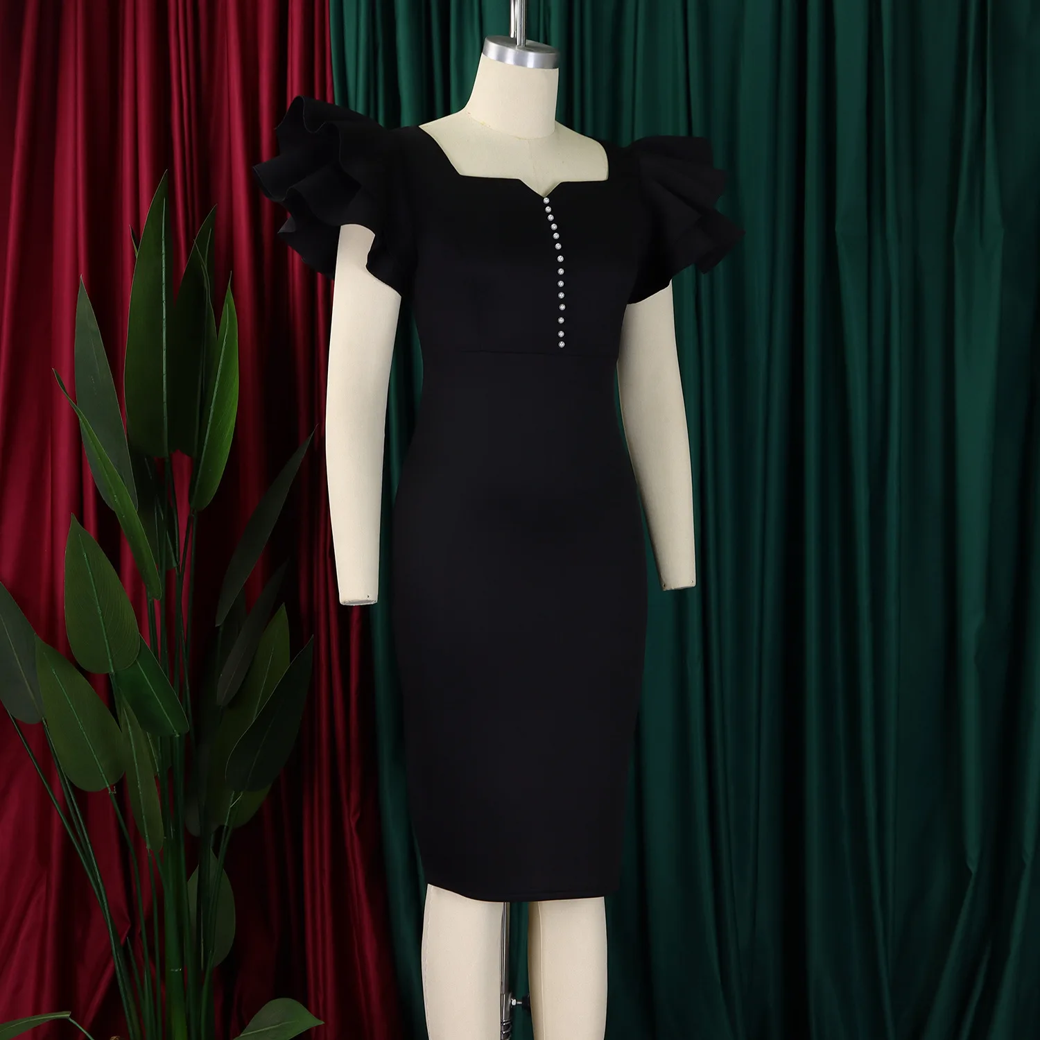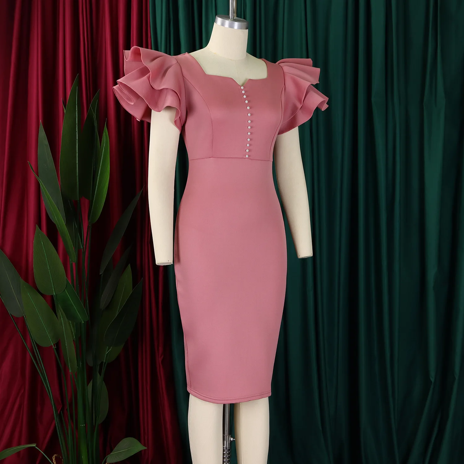 Summer Fashion Women's Nail-Beaded Lotus Sleeve Wrapped Hip Banquet Dress Cascading Style Elegant Evening Gown