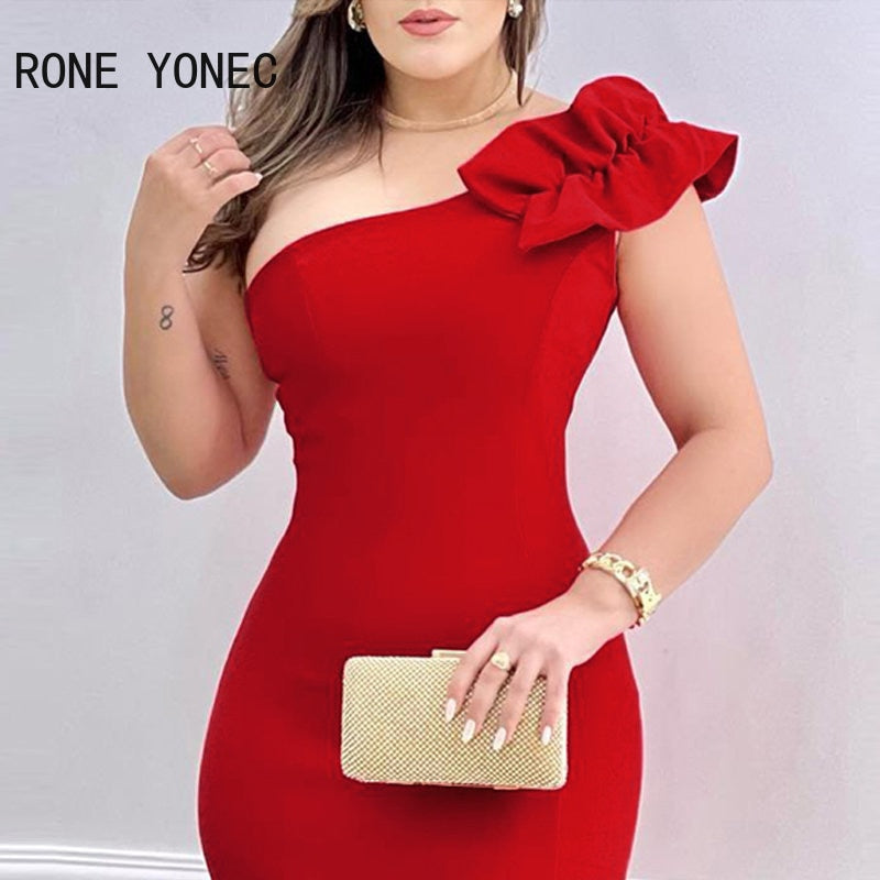 Women Elegant Solid Diagonal Collar Sleeveless Mini Bodycon Formal Party Dress